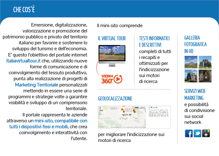 Stiamo digitalizzando e valorizzando già , da oltre due anni, il territorio italiano. Abbiamo dato visibilità a migliaia di siti del patrimonio pubblico e privato. Abbiamo utilizzato i migliori strumenti e le tecnologie più avanzate di rappresentazione fotografica per generare l’interesse degli utenti con immagini immersive ed emozionali.