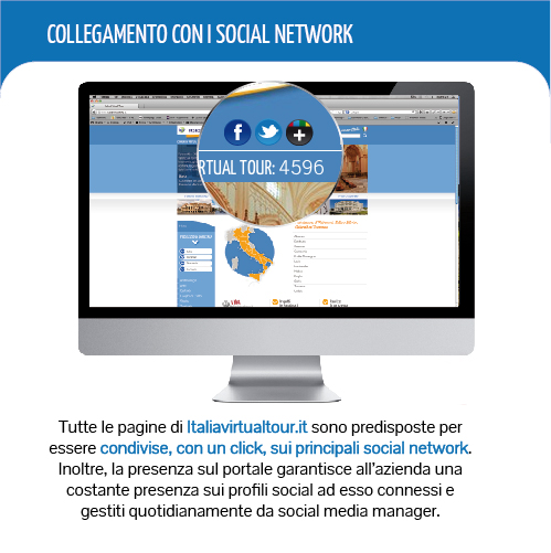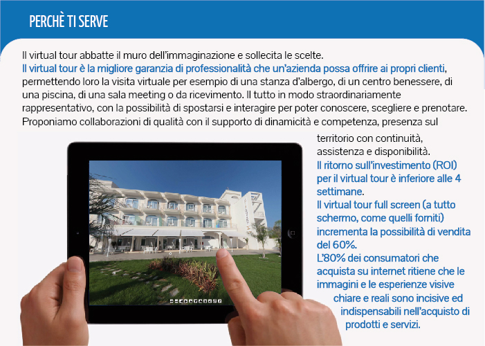 Un sito web aggiornato e ricco di contenuti è il biglietto da visita ideale per presentare e promuovere la vostra azienda. Una grafica accattivante e una struttura ottimizzata per i motori di ricerca rappresentano il punto di partenza ideale per conquistare la rete. L’interesse del potenziale cliente sarà sicuramente amplificato dalla presenza dei virtual tour, la vera marcia in più del vostro sito web.